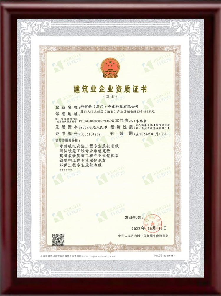 十月上旬,科銳特(廈門)凈化科技有限公司順利通過審批取得《建筑機電安裝工程專業承包壹級》資質。(凈化工程)